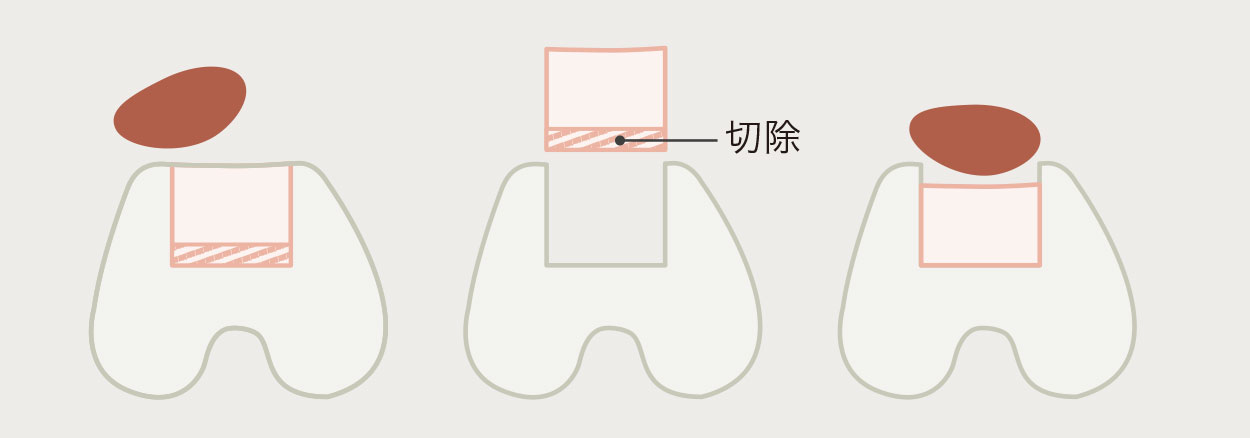 滑車造溝術では、大腿骨の骨を楔(くさび)状もしくはブロック状に切除して深い溝を形成します。
