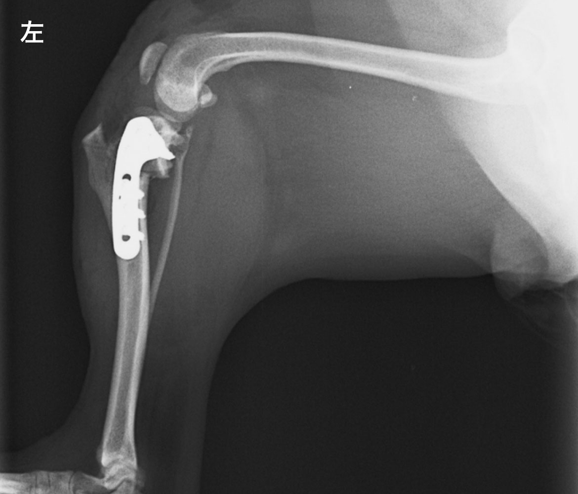 前十字靭帯断裂 (左後肢)脛骨が右後肢と比較して前方に変位しているのがわかります。脛骨と大腿骨が接する面がズレて開きができ、上からも下からも力の受け渡しができない状態です。 -