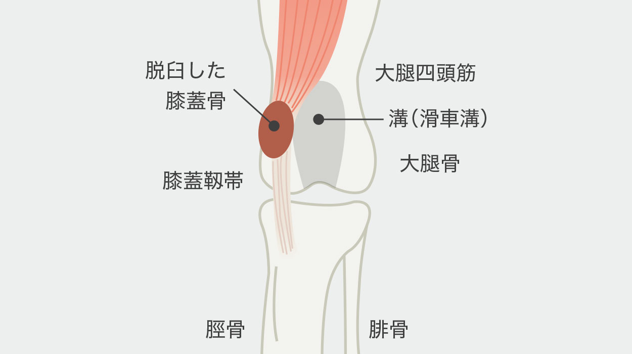 膝蓋骨が溝から完全に外れた状態を指します。外れかけている状態は脱臼の前段階の「亜脱臼」となります。亜脱臼は自然に戻ることも多いので症状を見逃すこともありますが、繰り返しているうちに外れることが増えていき、脱臼へ至るケースが大半です。