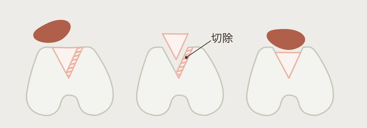 滑車造溝術では、大腿骨の骨を楔(くさび)状もしくはブロック状に切除して深い溝を形成します。