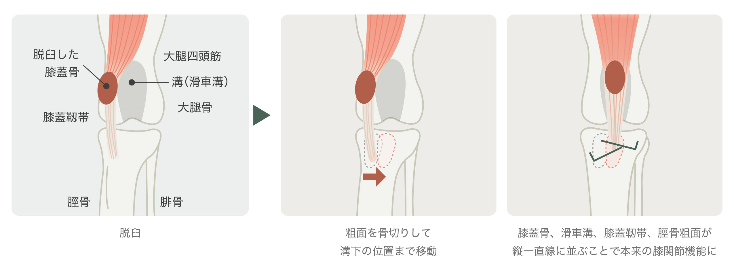 成長期に脱臼が起きると、膝蓋骨と膝蓋靱帯に引っ張られる形で脛骨もねじれます。その状態で成長すると、脛骨粗面(膝蓋靭帯が付着しているザラザラした部分)がまっすぐ前を向かず、内向きまたは外向きで定着してしまいます。滑車造溝術で溝を造り、脱臼を整復しても、脛骨のねじれをそのままにしておくと、脛骨粗面に付着している膝蓋靭帯が膝蓋骨を引っ張り戻すことになり、再脱臼のリスクが高くなります。