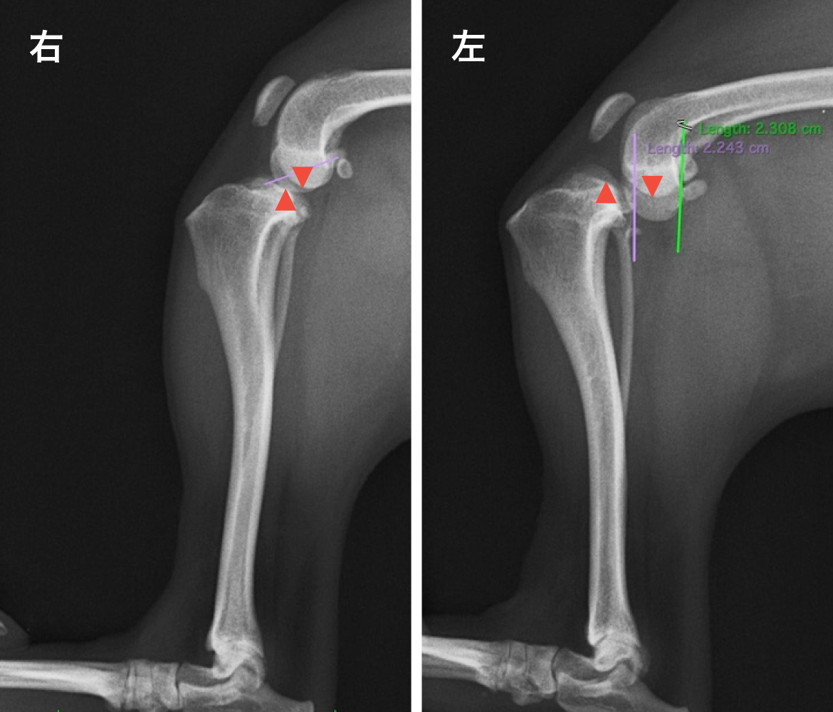 前十字靭帯断裂 (左後肢)脛骨が右後肢と比較して前方に変位しているのがわかります。脛骨と大腿骨が接する面がズレて開きができ、上からも下からも力の受け渡しができない状態です。 -