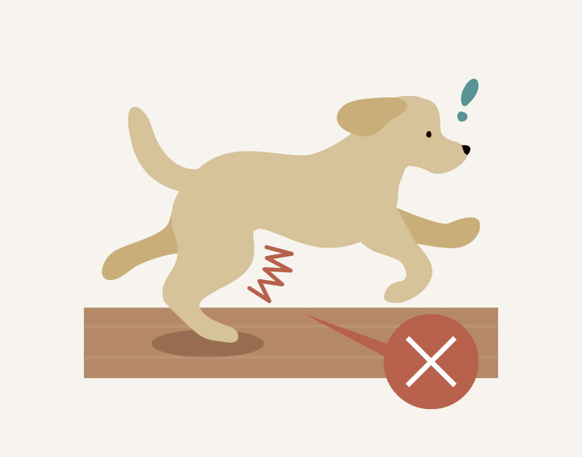 滑らせない!フローリングなど平滑な床材は、爪を使って蹴り出せないため、歩く時も方向転換する時も膝にとって大きな負担となります。滑らない素材をとりいれて安全な住環境を整えましょう。 -