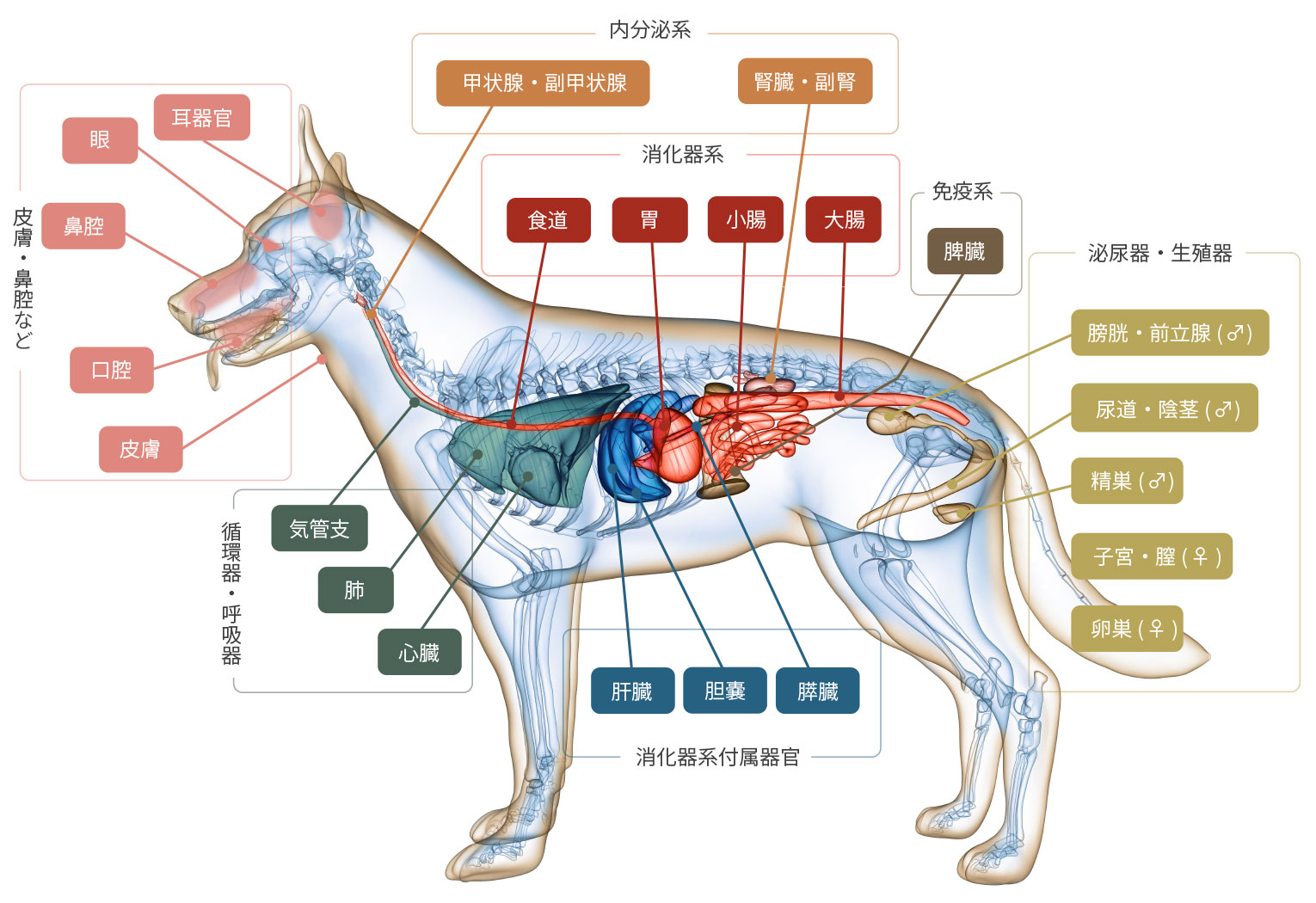 脾臓 - 血管肉腫やリンパ腫など悪性腫瘍が多く見られる臓器のため全摘となるケースもありますが、日常生活への影響は少ないと言われています。